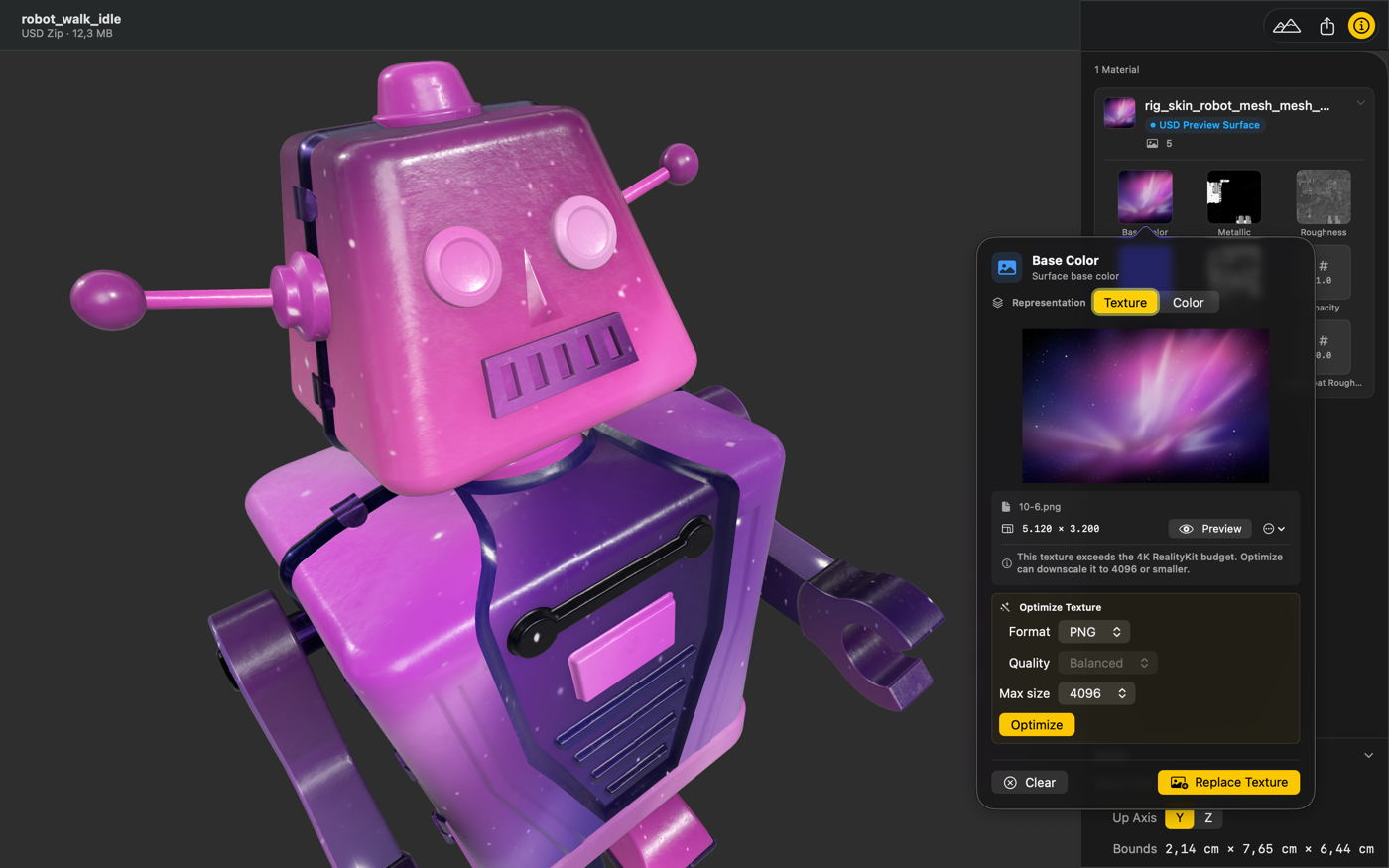 Bring in real scene files, inspect them in a RealityKit viewport, adjust materials, optimize textures, and export USDZ for Quick Look, iPhone, iPad, and visionOS-adjacent delivery.